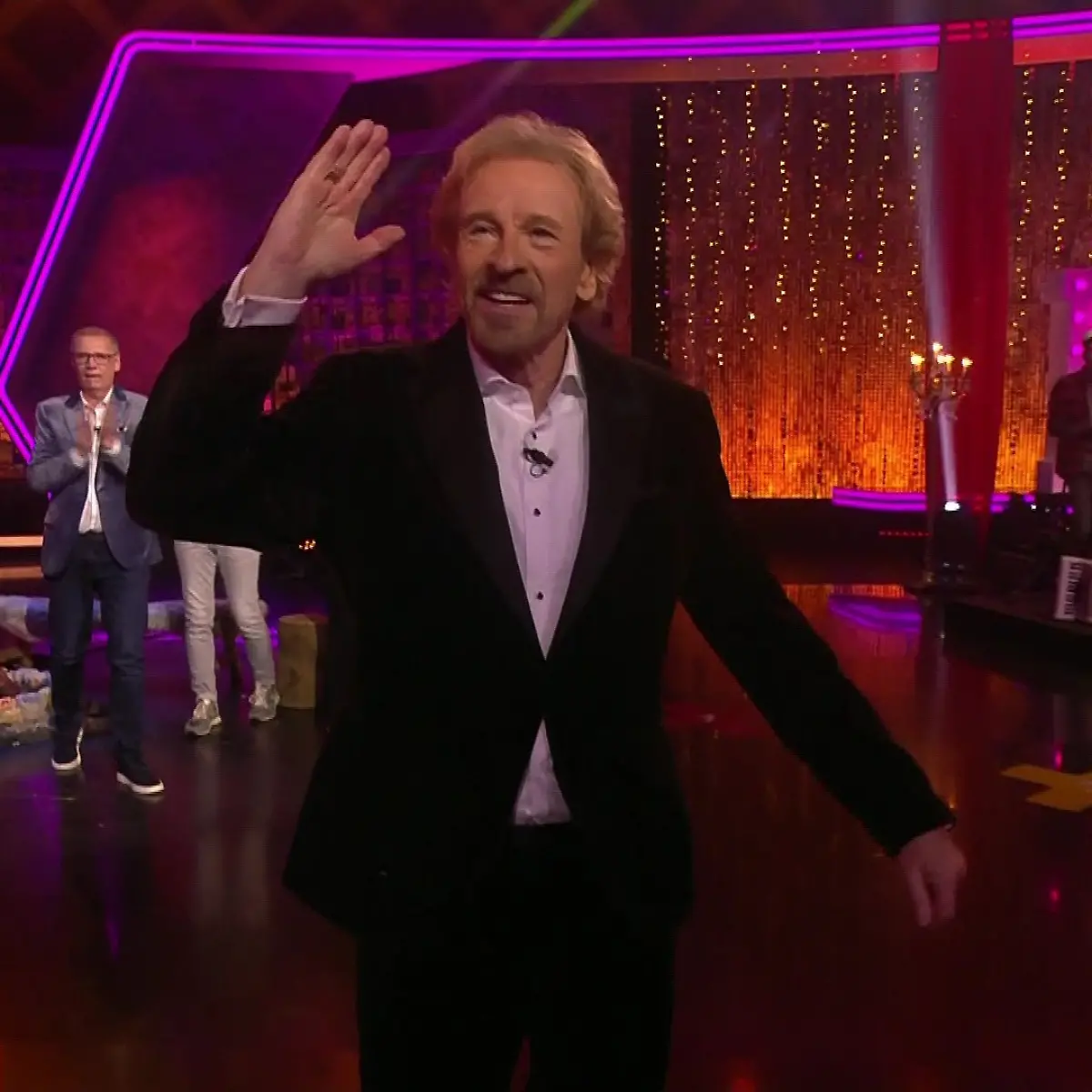 In einem Augenblick, der als einer der bewegendsten und zugleich traurigsten der deutschen Fernsehgeschichte in Erinnerung bleiben wird, hat Thomas Gottschalk seine letzte große Bühne verlassen. Es war nicht einfach nur eine Show, es war das endgültige Ende einer Ära, die über vier Jahrzehnte hinweg die Samstagabende der Nation geprägt hatte. Umhüllt von goldenem Konfetti, begleitet von den Klängen von Status Quo’s „Rockin’ All Over the World“ und, was noch viel wichtiger war, von seiner geliebten Ehefrau Karina, schritt der größte Entertainer Deutschlands aus dem Scheinwerferlicht ins Private. Der Moment, der sich bei der Live-Show „Denn sie wissen nicht, was passiert“ ereignete, war ein Abschied unter tosendem Applaus, der jedoch von einer tiefen Wehmut und einer schockierenden Wahrheit überschattet wurde: Gottschalk zieht sich vollständig zurück, eine Entscheidung, die nur wenige Wochen nach Bekanntwerden seiner Krebsdiagnose erfolgte.