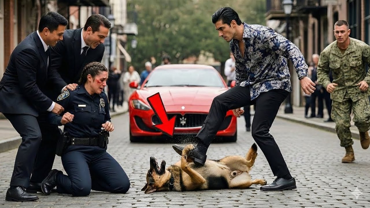 In dem Moment, als die Polizistin auf den Knien auf das Kopfsteinpflaster schlug, schien die Straße einzufrieren, denn Autorität wirkt normalerweise nicht hilflos und Angst zeigt sich normalerweise nicht auf einem trainierten Gesicht. Doch jetzt war sie da, scharf und unbestreitbar, während der reiche junge Mann lachte und seinen polierten Schuh hob und ihn hart gegen die Rippen des K9 schlug, der neben ihr lag, und das Geräusch, das aus der Brust des Hundes kam, war weder ein bellen noch ein Knurren. Es war ein